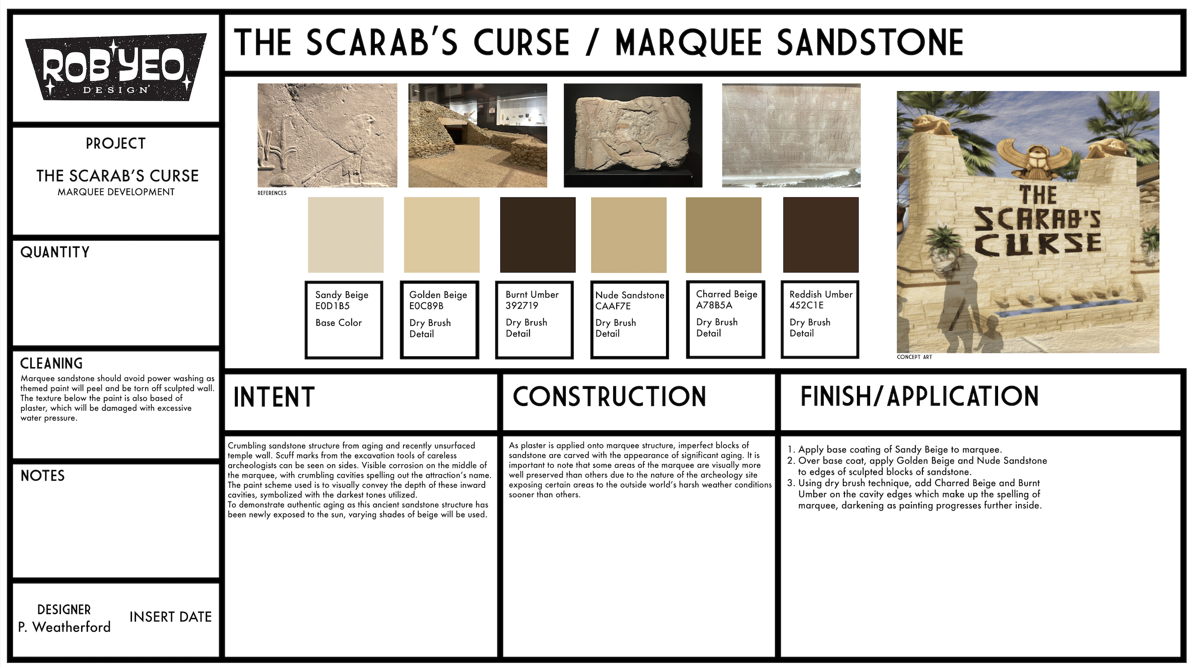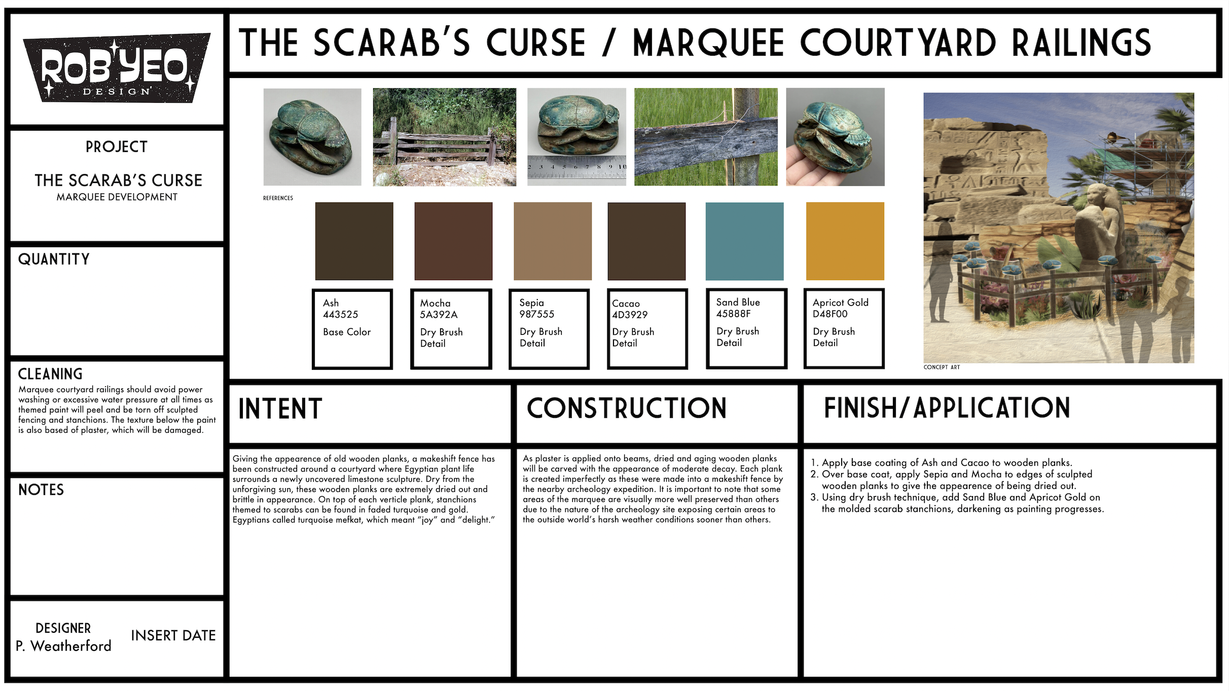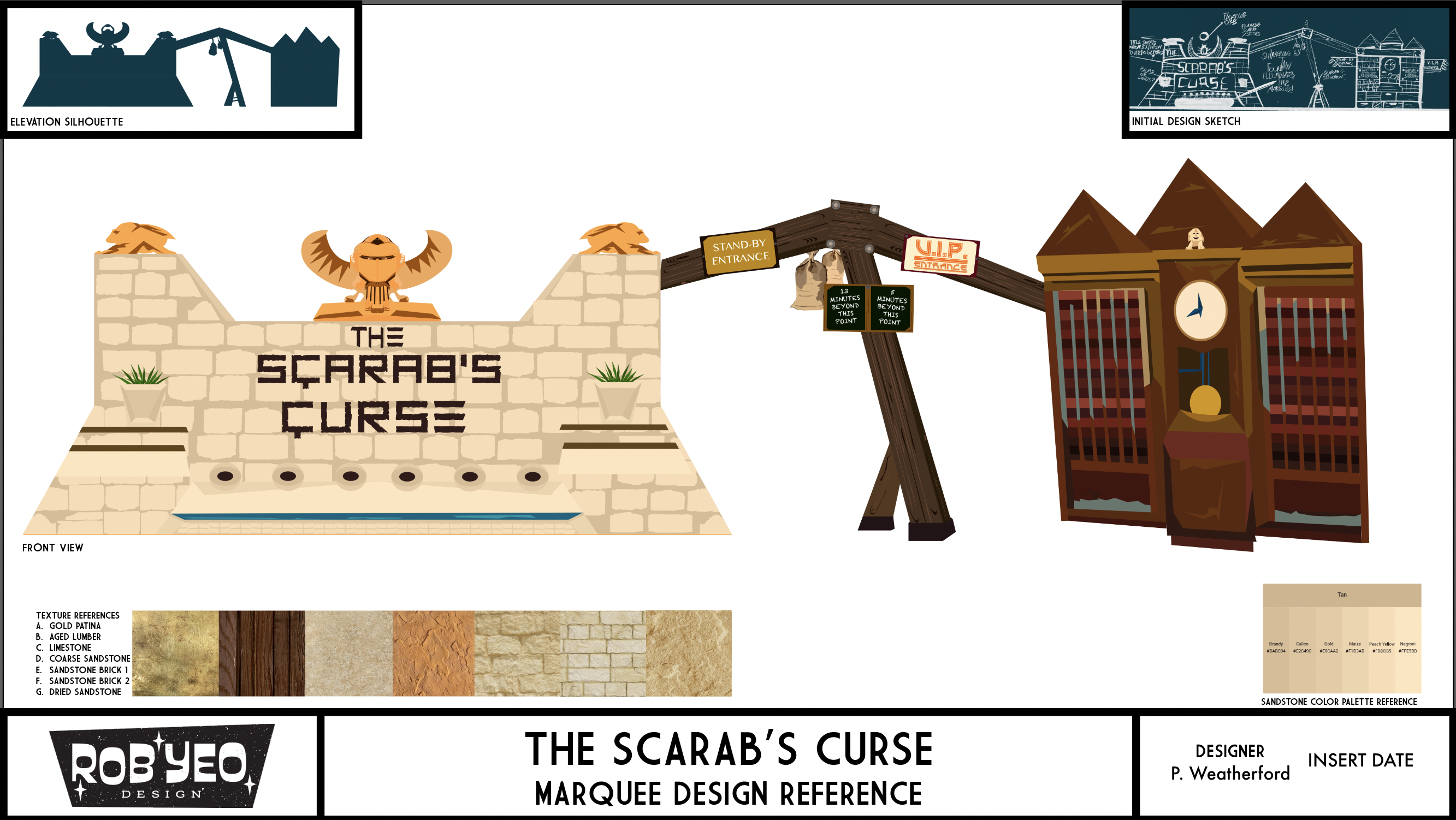 I was tasked with designing a marquee for a new attraction – “The Scarab’s Curse.” Set in Cairo, 1922, this walkthrough show features an archaeologist who leads guests deep into the recently discovered tomb of Tutankhamun. Along the way guests would face various skin crawling horror special effects before emerging safely back to the surface. Requirements for the marquee were for it to be freestanding and positioned at the queue entrance. The attraction’s name, signs for both Standby and VIP lanes (with separate wait times) were also required.
